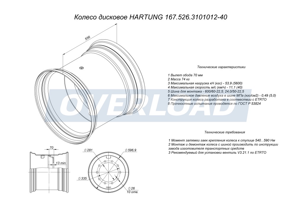Диск колёсный HARTUNG 20.0x22.5 10/335 d281 ET-70
